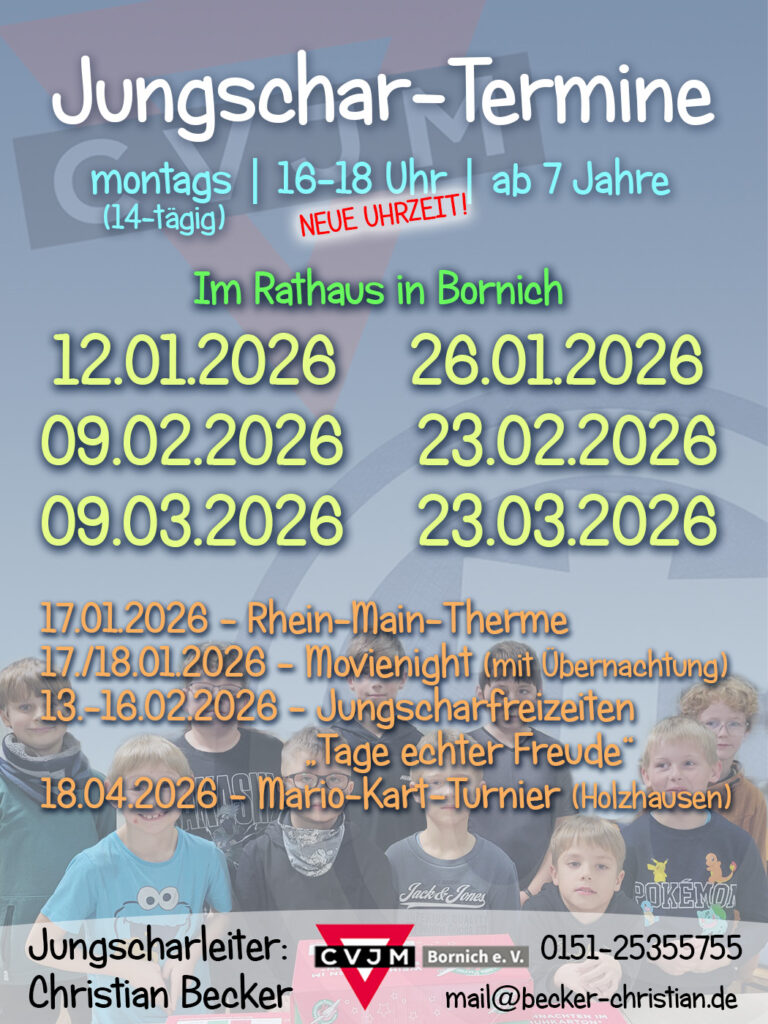Die Jungschartermine sind alle unter Vorbehalt. Je nach beruflicher Terminüberschneidungen können Verschiebungen und Absagen von Jungscharstunden möglich sein.